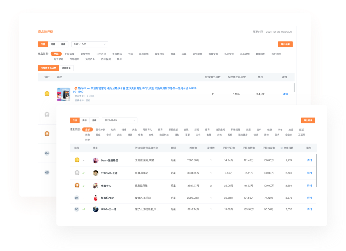 多項(xiàng)內(nèi)容全面解讀達(dá)人,歷史內(nèi)容追蹤,AI去水粉絲預(yù)估,智能算法評估達(dá)人價(jià)值,有效挖掘優(yōu)質(zhì)達(dá)人
